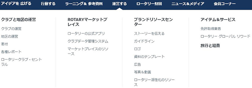 「運営する」カテゴリには「クラブと地区の運営」「ROTARYマーケットプレイス」「ブランドリソースセンター」「アイテム&サービス」のサブカテゴリがありますが、特に重要なのは「クラブと地区の運営」サブカテゴリの中の「ロータリークラブセントラル」です。クラブの概況や活動目標の把握と管理を行う上では欠かせないツールです。また、ロータリーのロゴマークや年度テーマ画像などの活用方法を掲載した「ブランドリソースセンター」も必ず確認した方が良い資料です。