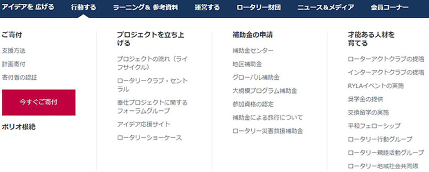 「ご寄付」のサブカテゴリにはロータリーが展開する様々な奉仕事業の原資となる「ロータリー財団寄付」に関する解説が掲載されています。ロータリアンとしての「行動」の第一歩は「寄付金の拠出」に始まるといっても過言ではありませんが、どうせ寄付するなら内容を理解したうえで実施した方が納得感もありますよね!