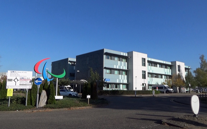 病院の入口には、赤、青、緑の3色からなるパラリンピックのシンボルマーク「スリーアギトス」のモニュメントが立っています。この病院は、第二次世界大戦でノルマンディー作戦が計画された時、負傷した兵士、特に脊髄損傷した重症の兵士の治療にあたるために、1944年に脊髄損傷科が設立されました。