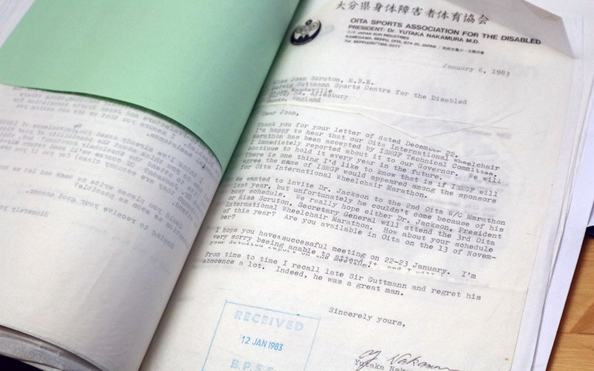 資料管理員の方に探してもらって出てきたのが、大分国際車いすマラソンに関する資料でした。この大会は中村博士の発案で1981年に始まった、世界初の車いすの選手だけが参加するマラソンです。最初の2回はハーフマラソンでした。1983年の第3回大会で初めてフルマラソンの大会が開けるようになったときに、大会事務局は国際大会の新たな種目として公認するよう、発祥の地に申請していました。その時にやりとりされた資料が残されています。