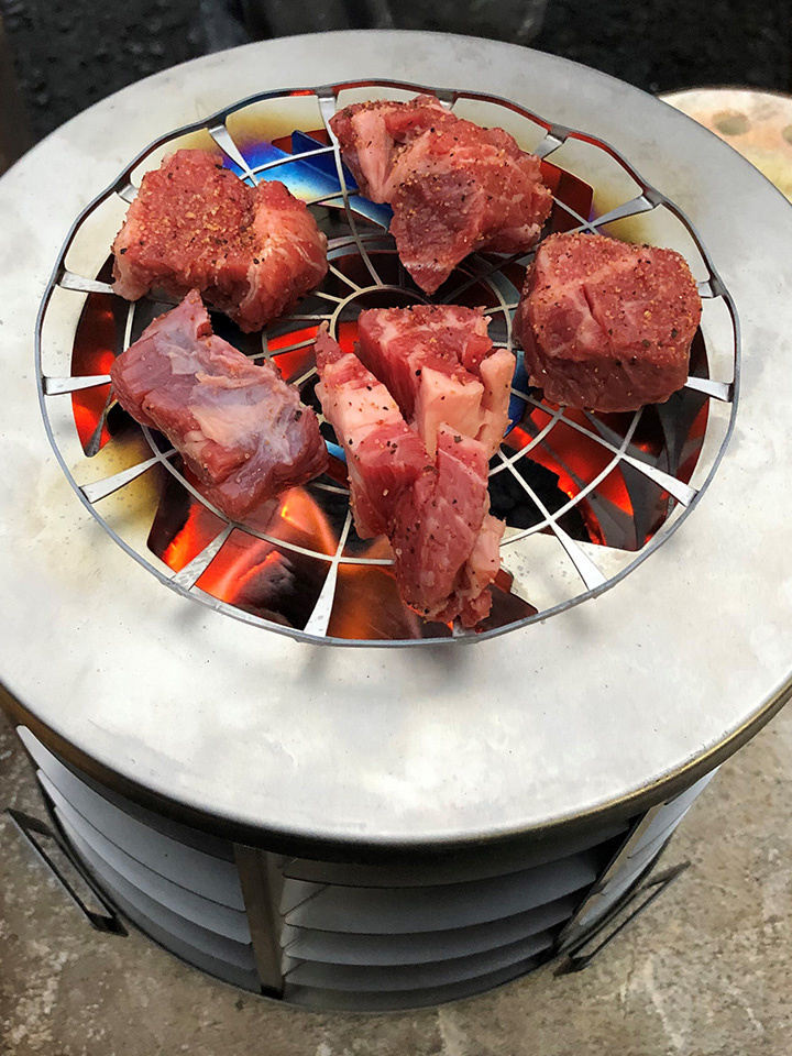 燃料の木炭が完全燃焼し、肉から下に落ちる脂も気化し、煙を出さずに燃え尽きる。火力は通常のグリルの2倍で、肉は片面1分で焼ける。風の影響を抑制するので、屋外でのバーベキューでも活躍する。