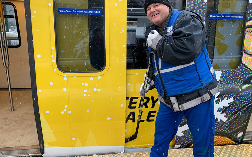 カナダではアイスホッケーが人気スポーツですが、写真は駅員さんがアイスホッケーのスティックを使って電車のドアについた凍った雪を取り除いてる様子です。