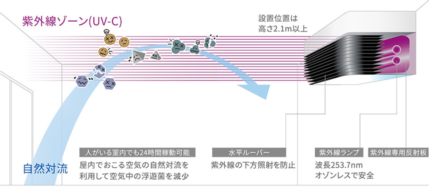 また、感染症を予防する目的で市中ではアルコールによる手指消毒や次亜塩素酸等による物品の清拭による除菌が広まっていますが、これらは特定の部位やエリアの消毒には有効ですが、空気中に浮遊しているウイルスや細菌を不活化させることはできません。もし、浮遊菌や浮遊ウイルスを不活化させられる消毒液を空間噴霧した場合、それを吸引する人体に影響がないはずがありません。人がいる空間で、効果と安全性を両立させる空間清浄の方法は、このエアロシールドで実現できる空間の上部を紫外線照射する方法(Upper-Room UVGI)が世界的にも認められ、推奨されている方法です。