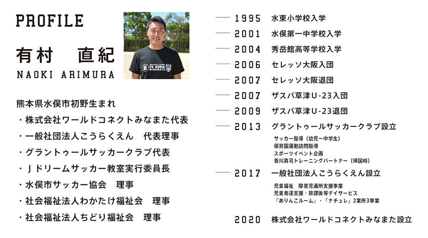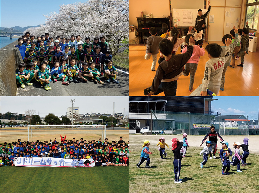 プロ生活3年間で感じた事は、プロ選手の技術の高さはもちろん、練習に取り組む姿勢や自分を信じ継続して努力する忍耐力、何事にも恐れずチャレンジする精神力。その経験を地元水俣の子ども達へサッカー指導で恩返しをするため、地元クラブでサッカー指導を4年経て、2013年に『グラントゥールSC』という幼児~小学生までのサッカー育成クラブを設立。同時期に地域スポーツ貢献活動『Jドリームサッカー教室』『保育園訪問指導』も設立しスポーツで町おこしをモットーに子ども達が現役のプロ選手と直接関われる機会なども作ってきました。とにかく、スポーツと子ども達、そして地域が一つになり盛り上がっていける仕掛けを、人が成長していける環境をたくさんつくっていけたらと活動しています。