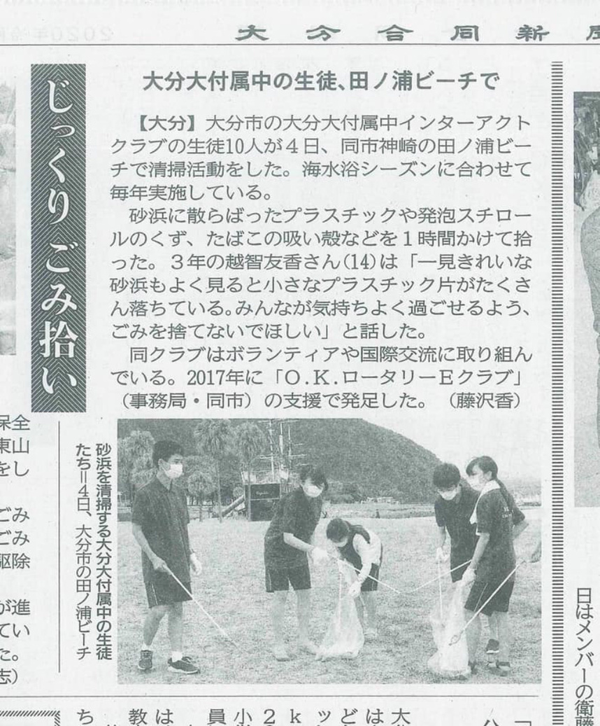 7月4日 当クラブインターアクト(大分大学教育学部附属中学校)の毎年恒例となっている、海岸清掃が行われました。ゴミを拾う姿はとても美しく、ゴミを拾うとその場所もきれいになるり、さらに自分の心もきれいになる。次年度はお近くの会員は是非ご参加ください。