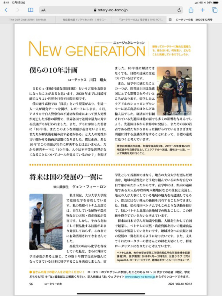 「ロータリーの友」12月号に当米山奨学生ロン君の事が掲載されました。