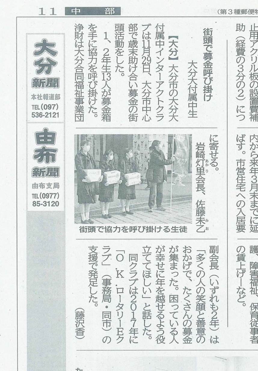 11月29日 毎年恒例のインターアクト(大分大学教育学部附属中学校)歳末募金活動が行われました。インターアクトの皆様、お疲れさまでした!