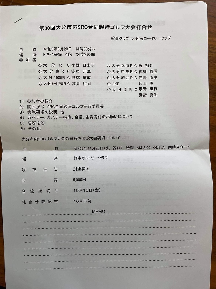 8月20日大分市内9RCクラブ(大分第4グループ)合同親睦ゴルフ大会の打ち合わせが行われ、クラブを代表して参加してきました。
