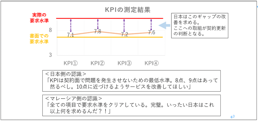 一方、海外では、契約書や別紙で定めているSLAやKPIで判断しているように感じます。「書面に定めていることが全て」と言ってしまえば確かに海外側の考え方も理解できるものがあります。