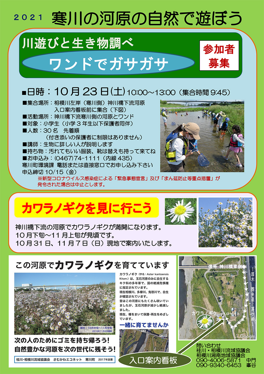 地元の小学生を対象としたイベント企画「寒川の河原の自然で遊ぼう」が安全に子供たちの笑顔の中でできたことにスマイルします。参考に当日のチラシと写真を添付します。