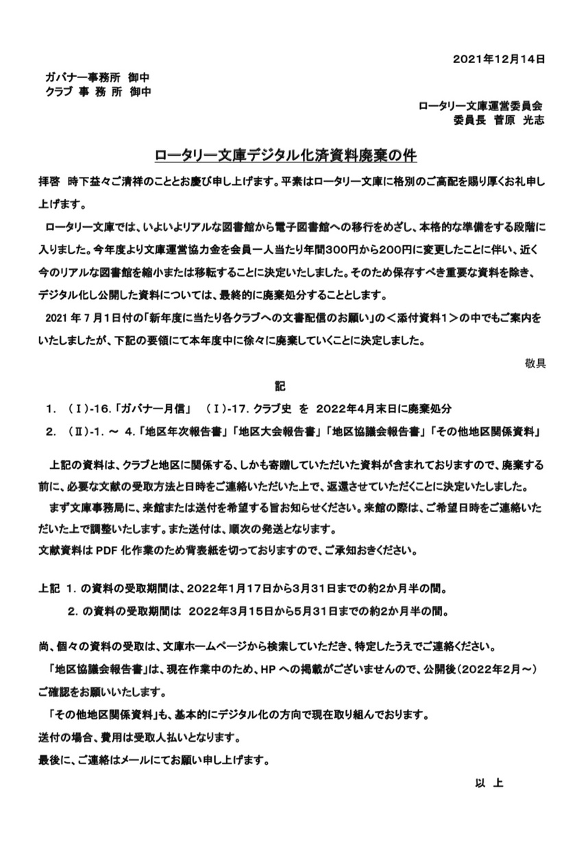 《ロータリー文庫デジタル化済資料廃棄の件》