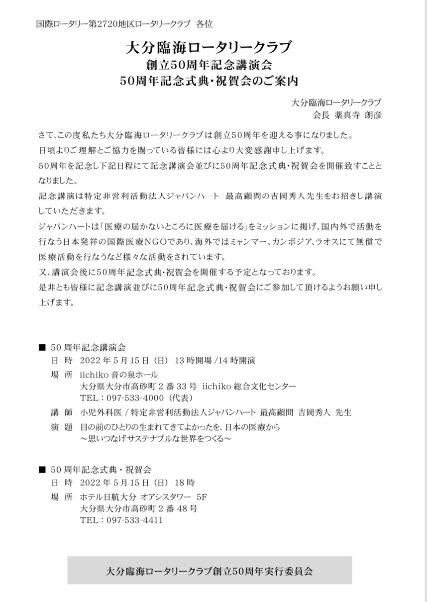 《大分臨海ロータリークラブ 創立50周年記念講演会》