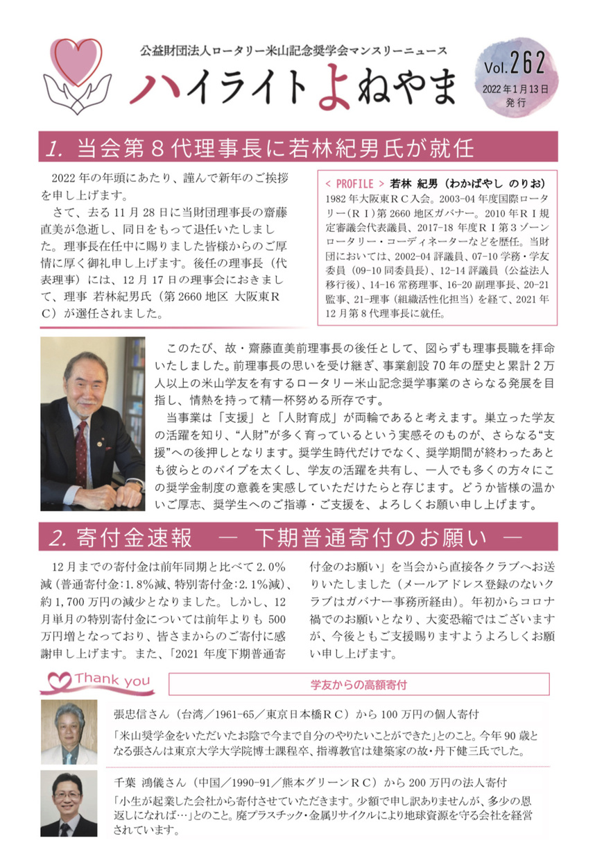 時下、益々ご活躍のこととお慶び申し上げます。日頃より米山奨学事業にご支援ご協力を賜り厚く御礼申し上げます。