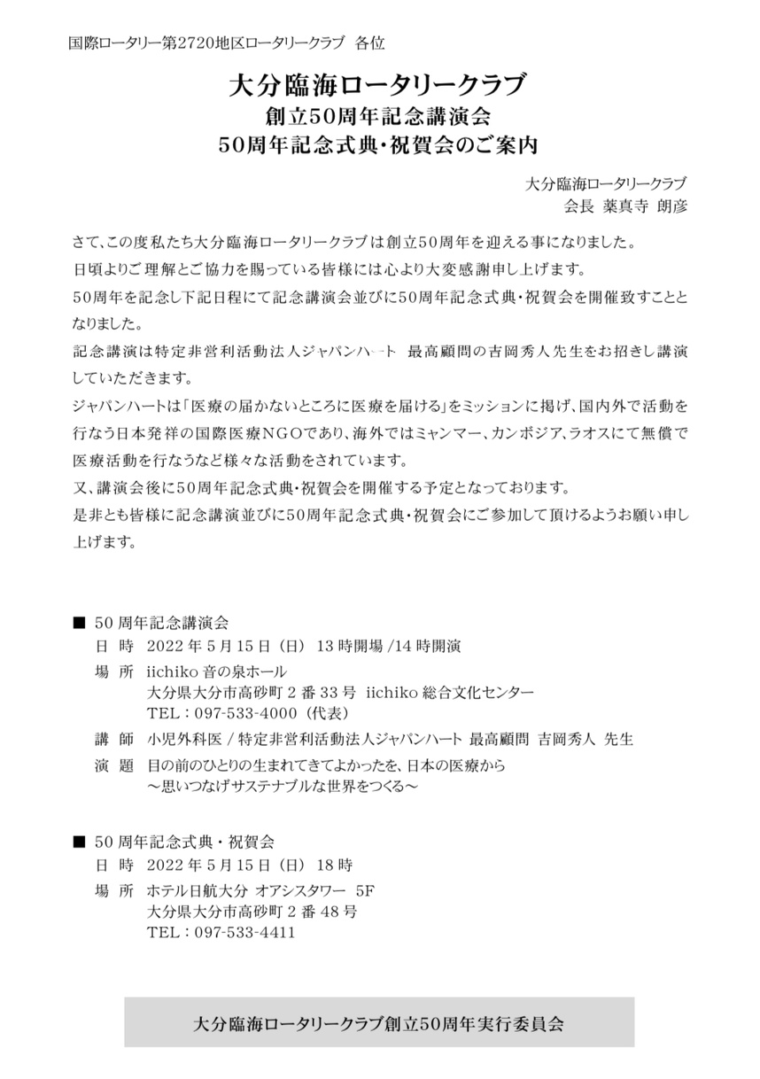 《大分臨海ロータリークラブ 創立50周年記念講演会》