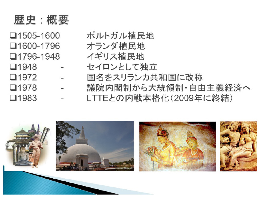 スリランカはいろいろな国の植民地になり、内線などの大変な時期を超えて平和になり、今までの歴史を作ってきています。