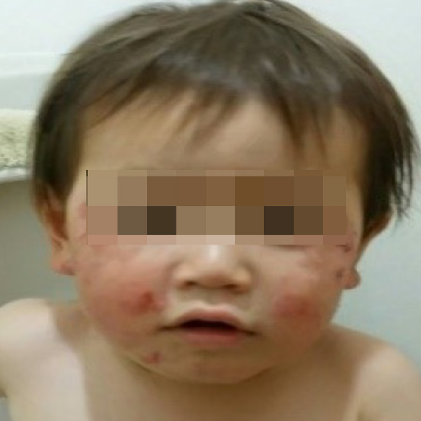【写真1】は2歳10ケ月の男の子でアトピー性皮膚炎と診断されていた。湯の花継続使用35日で、ほぼアトピーの症状は消失した。