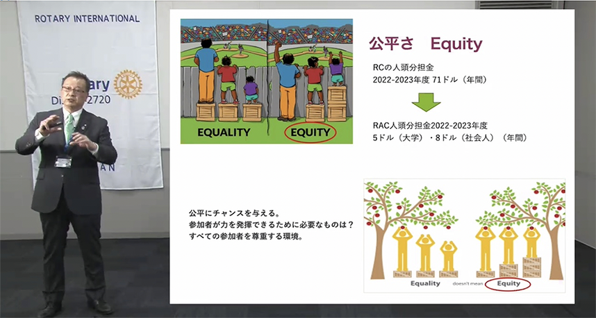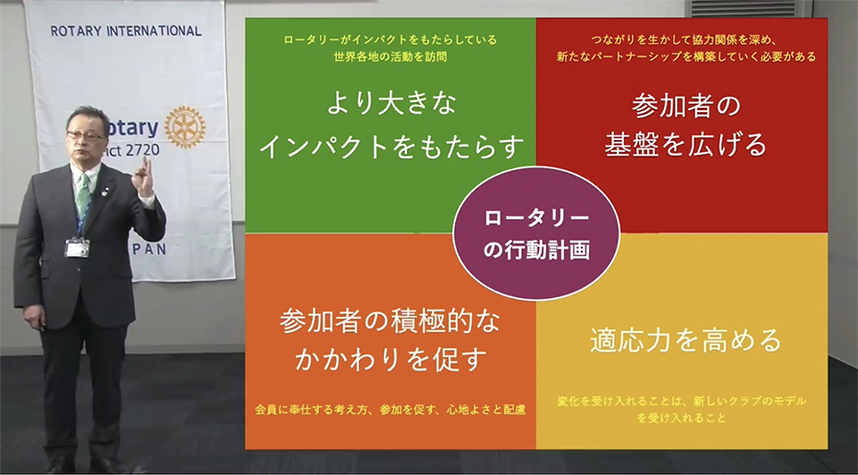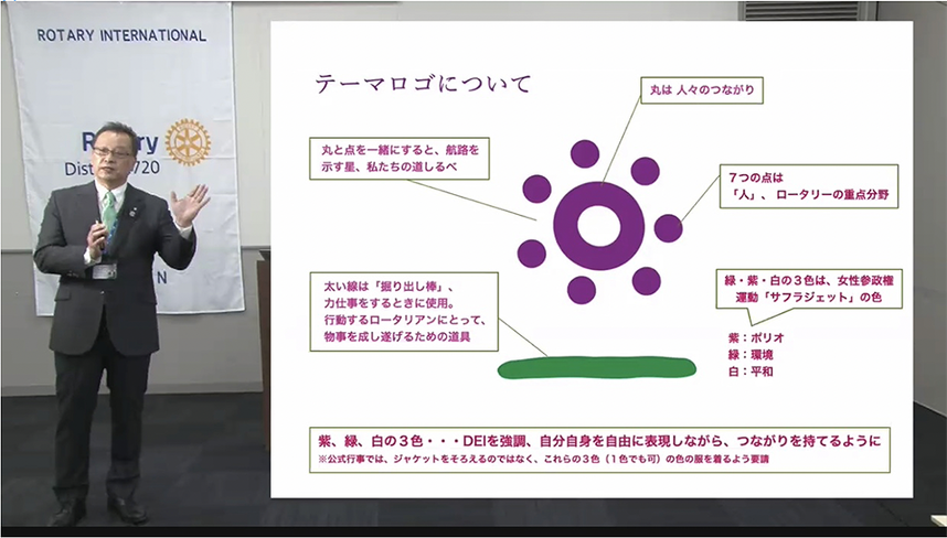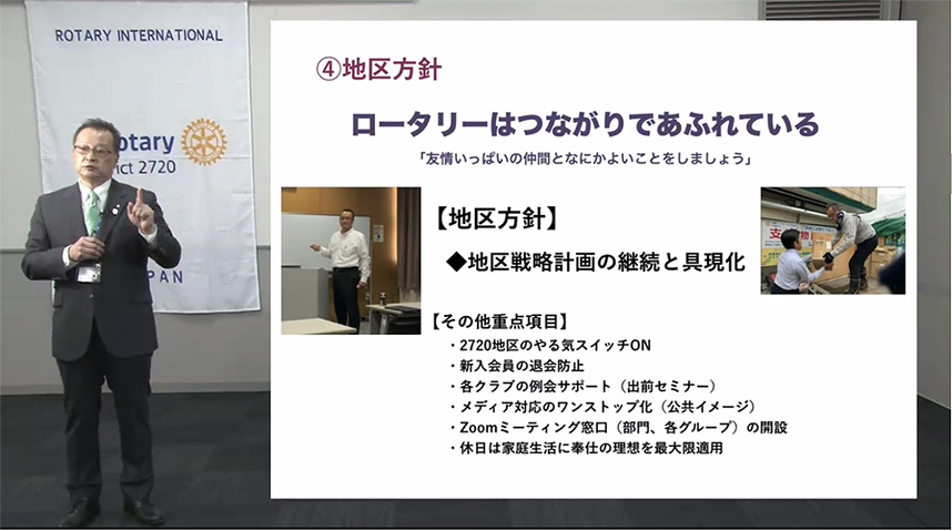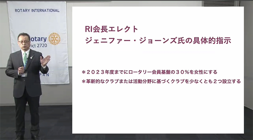 セミナーでは、国際ロータリー第2720地区ガバナーエレクト堀川 貴史様がジェニファー・ジョーンズ国際ロータリー(RI)会長エレクトのメッセージや次年度の地区方針について話しました。
