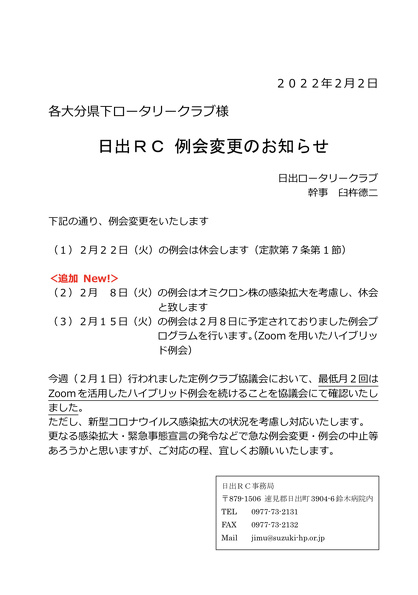例会 第27回【通算第213回】 2022年2月7日正午~2月14日正午(出席数・出席率2月14日正午)