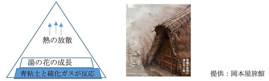 別府市には重要無形民俗文化財として「湯の花製法」があります。温泉ガスを均等に小屋内に噴出させ、その上に青粘土を敷き詰め、硫黄噴気と青粘土が化学反応を起こしてできた結晶を成長させ、採取、精製して湯の花を作っています(下図)。