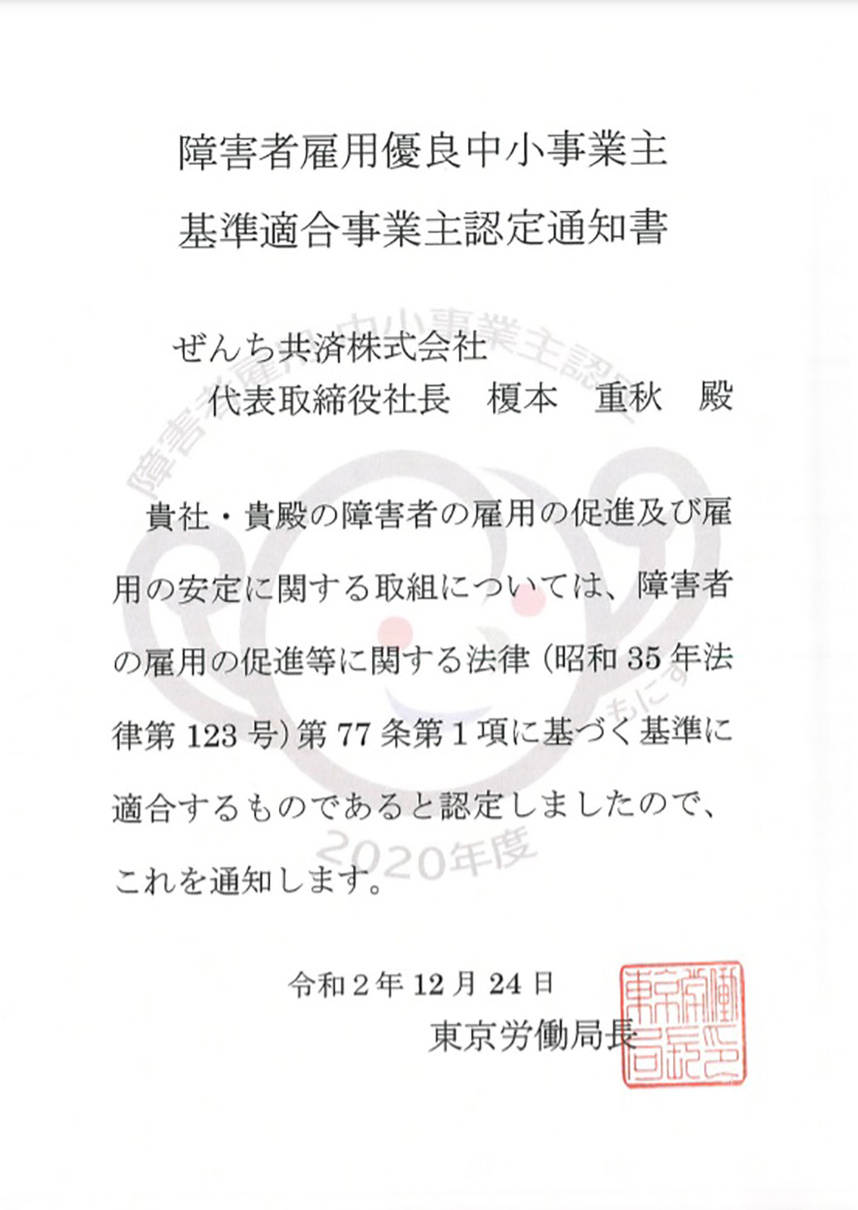 そして、これが契機となり、障害者雇用に関する優良な中小事業主を認定する「もにす認定」もいただくことができました。