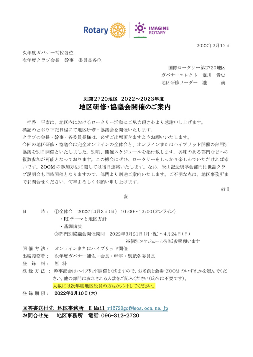 《RI第2720地区 2022~2023年度 地区研修・協議会開催のご案内》