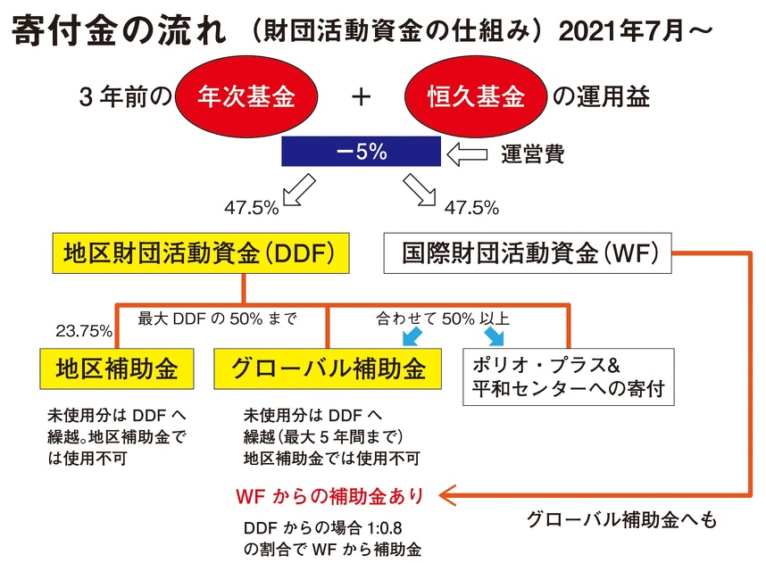 この恒久基金への寄付をした場合、 いただいた寄付は基金として積み上げ、その元金には手をつけずにその運用益のみを使用し ていきます。運用益は一般管理費等に使われるほか、一部はWFやDDF(運用益の地区シェ ア分の47.5%)地区で行うプロジェクトにも使用されます。