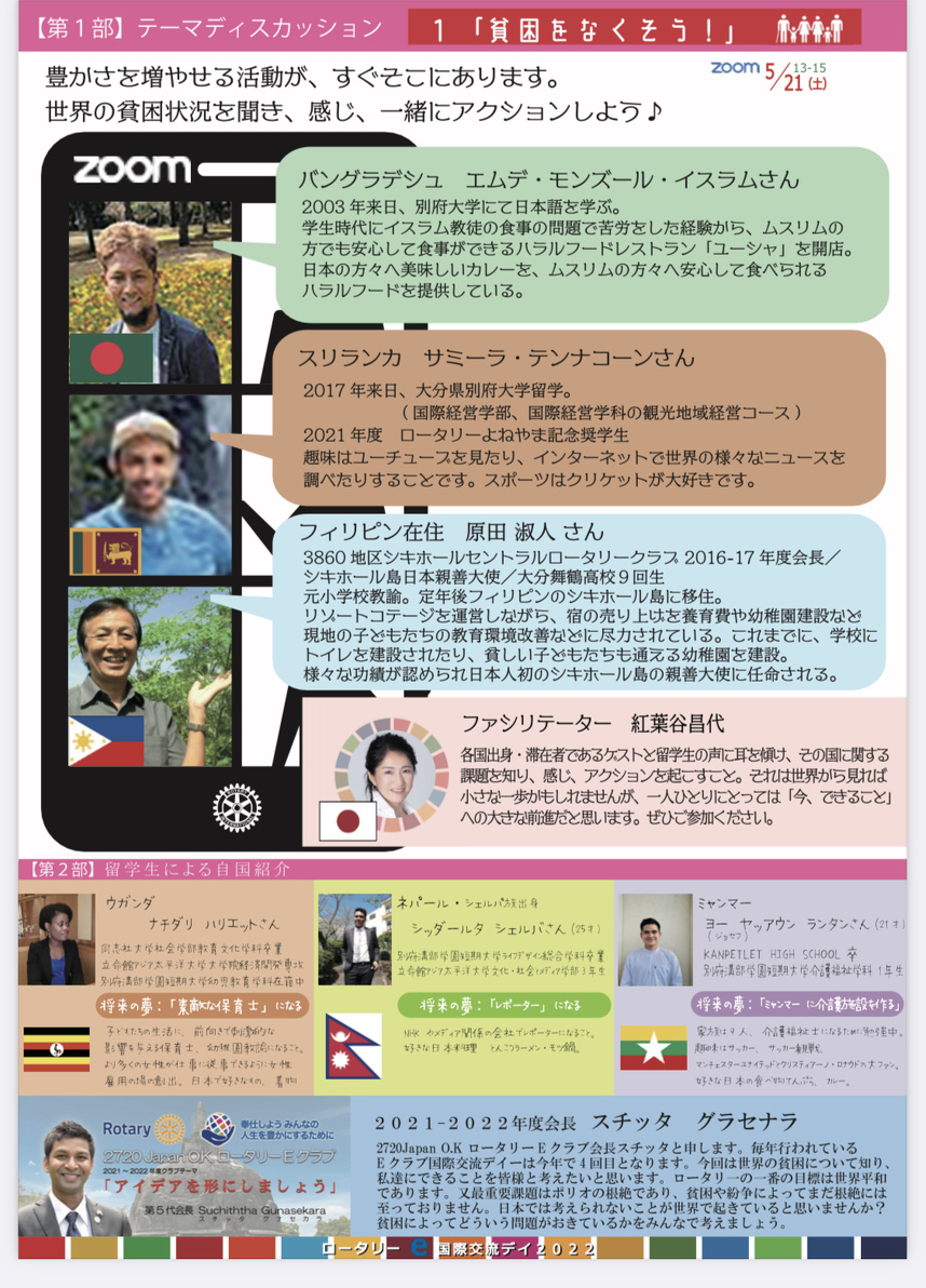 さて、先にご案内した「2021-22年度RYLAセミナー」について、新型コロナウィスル感染症 の実情を踏まえ、慎重な協議と検討を⾏った結果、対⾯による開催⽅法を⾒直して、ZOOMを利 ⽤したオンライン⽅式に変更することに決定しました。 セミナーの開催⽇を5⽉28⽇(⼟)のみの開催とし、プログラムについては、下記をご参照く ださい。RYLAセミナーは、「地域社会の次世代のリーダーがつながり、アイデアを広げ、⾏動 を起こすきっかけを⽣み出すイベント」とされており、⻘少年が社会において役⽴つプログラム を企画し、セミナーを開催いたします。