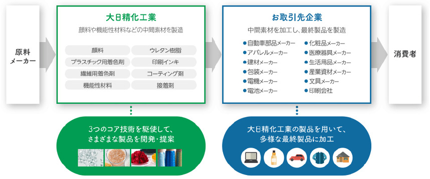 世界のいたるところで空間やモノは彩られています。大日精化工業は、「彩り」の素となる顔料だけでなく、プラスチック着色剤やインキ・コーティング剤、顔料分散体など、彩るものに合わせた「製品」も揃えています。さらに大日精化工業は、「こんな材料があれば、便利!」といわれる機能性材料や樹脂合成の開発力で高い評価をいただいています。