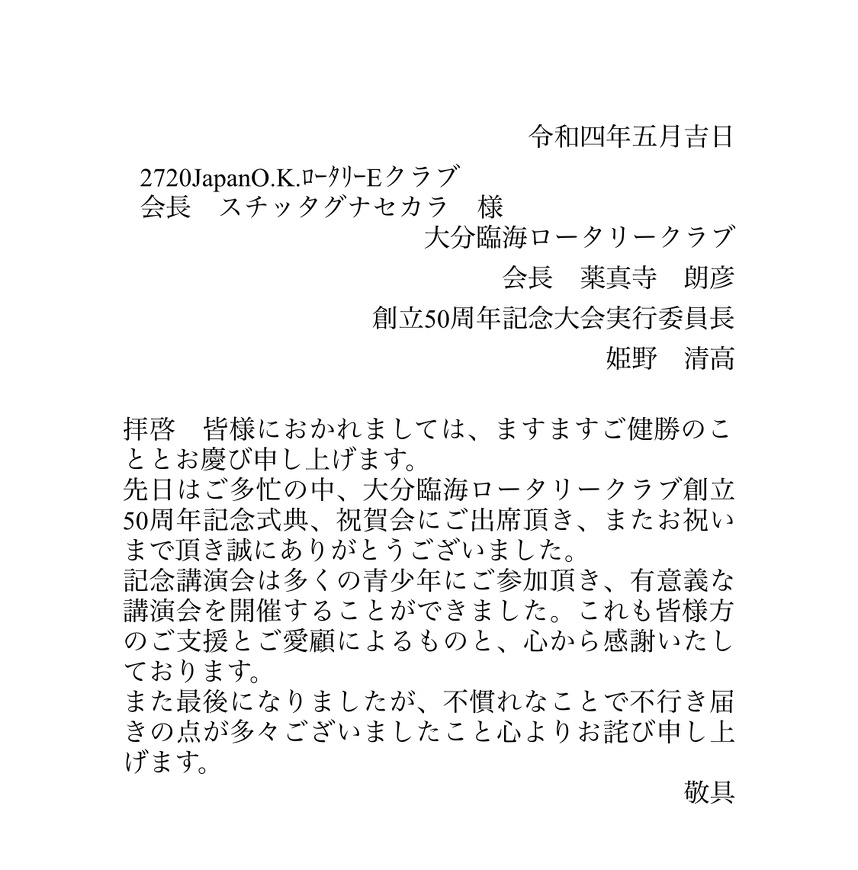初めての地区大会参加に続き、大分臨海RC様50周年記念講演、式典、祝賀会では撮影を、国際交流デイのイベントではファシリテーターを担当させていただき、ロータリー色に染まった学び多き楽しい1週間でした。