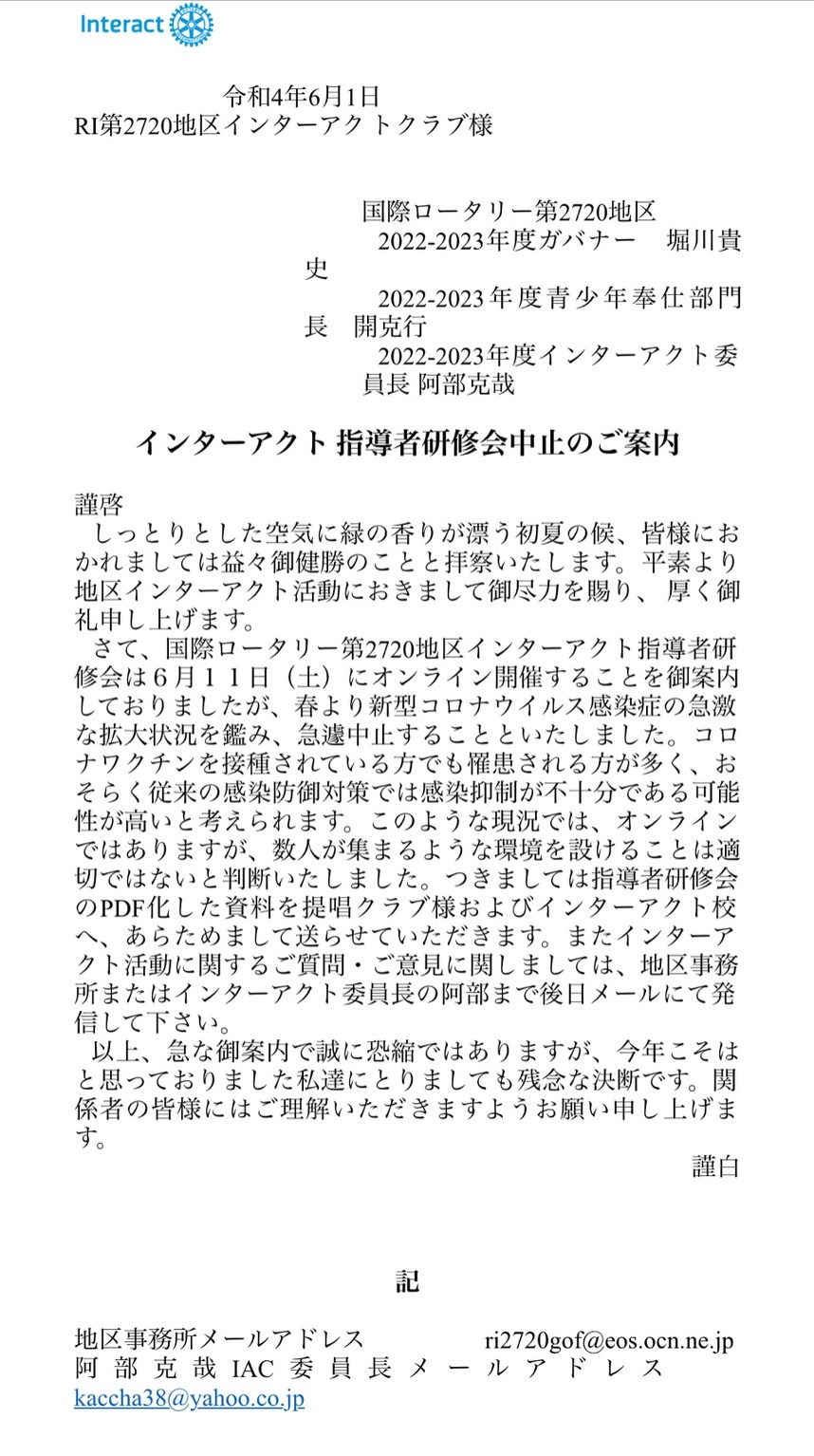 《インターアクト指導者研修会中止のご案内》
