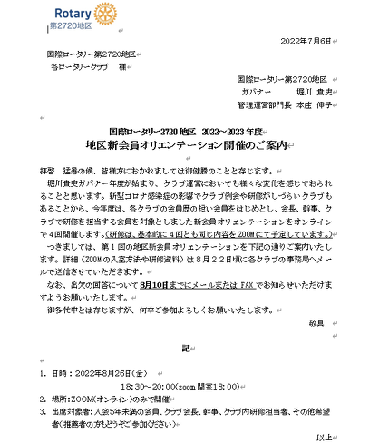 ロータリーについて学べる良い機会です。どなたでも参加できますので、ぜひご参加下さい。参加ご希望の方は8月9日(火)までに事務局の滝波さんにお申込み下さい。