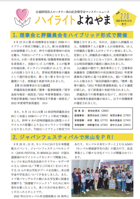 ハイライトよねやま270号が届きましたのでご案内いたします。