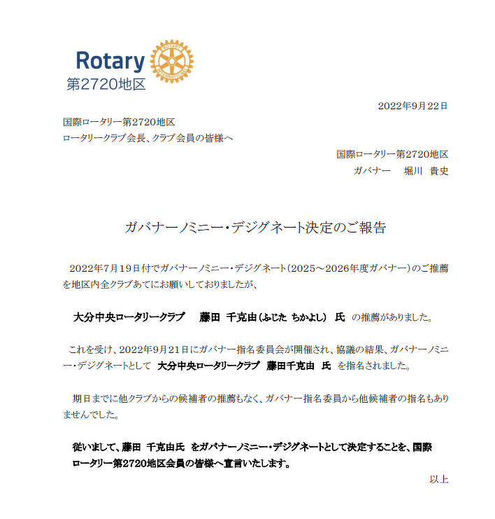 ガバナーノミニー・デジグネートに大分中央ロータリークラブ藤田千克由氏が指名されました。藤田氏は今年度ガバナー補佐としてもご活躍中です。