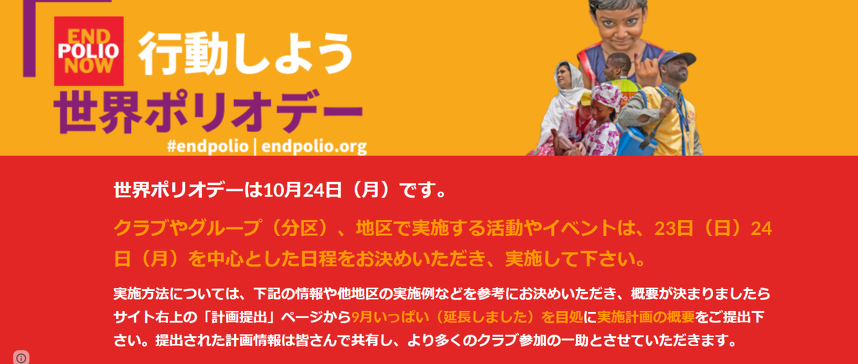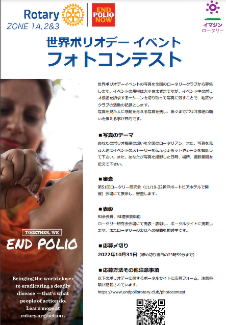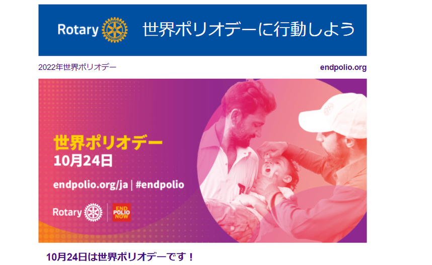 10月24日は世界ポリオデーです。世界ポリオデーについてのご案内が地区から届いておりますので、告知致します。会員の皆さまには世界ポリオデーについて知って頂きますとともに、ロータリーのポリオに対する取り組みをSNSなどで周知して頂けましたら幸いです。また、世界ポリオデーにちなんだフォトコンテストのご案内がございます。ふるってご応募下さい。