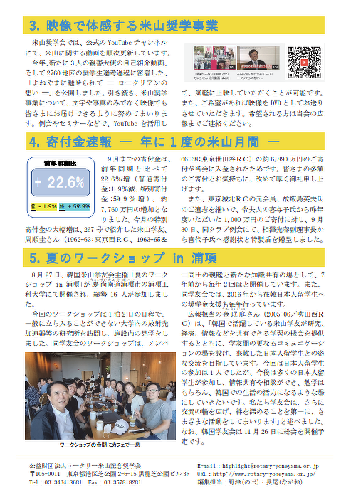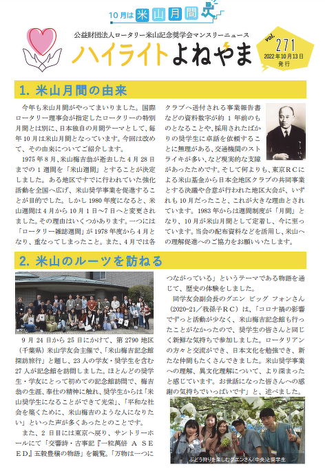 ハイライトよねやま271号が届きました。米山月間が10月に設定された由来やよねやまのルーツなど、ロータリーの歴史に関わる記事が掲載されています。みなさま、ぜひとも米山について知り、関心を高め、そしてさらなるご支援をお願い致します!