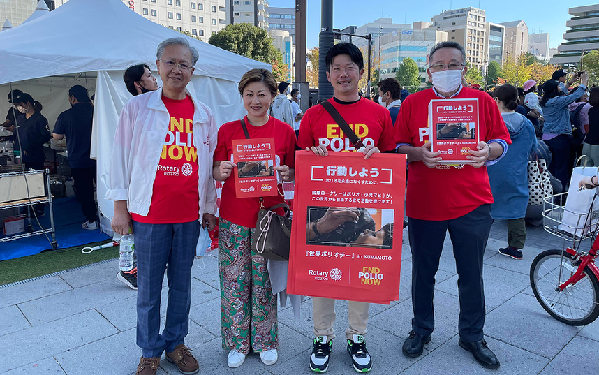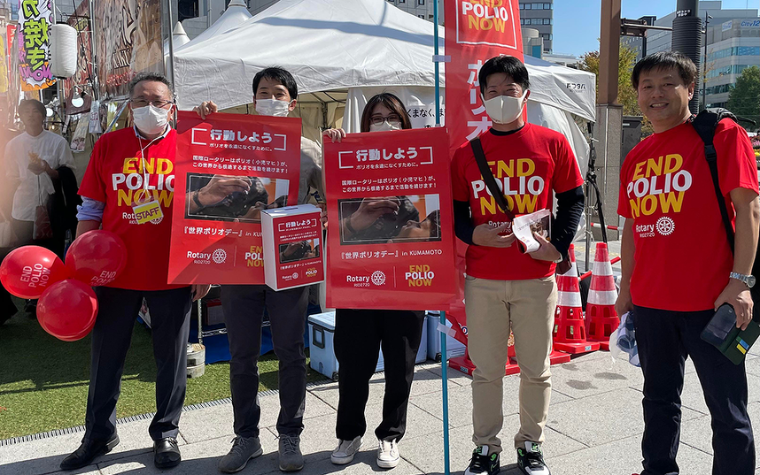 本日、10 月 24 日は「世界ポリオデー」ですね! 世界ポリオデーに向けて、2720地区では 2022 年 10 月 22 日(土)~23 日(日)熊本市の花畑広場で行われました熊本マチナカ音楽祭との連携を図りながら、サクラマチプロムナードを中心にサンロード新市街・下通アーケードにて 10 月 23 日(日)にポリオ根 絶募金活動を開催しました。Eクラブより、伊牟田会員、私の2名で参加してきました。熊本グリーンローターアクトクラブのメンバー二人と一緒に、声が枯れるまで募金へのご協力を呼び掛けてきました。