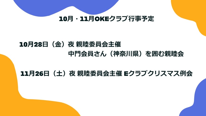 11月26日(土)夜、大分市内でEクラブのクリスマス例会を開催する予定です。会員の皆さま、ぜひスケジュールの確保をよろしくお願い致します。詳細は後日ご連絡申し上げます。