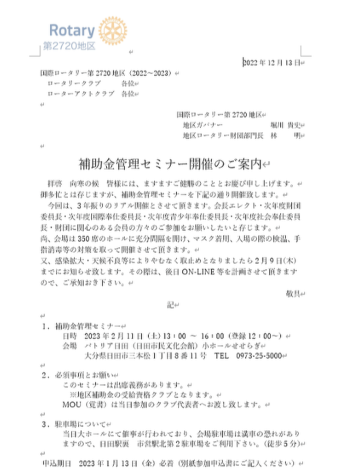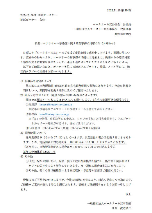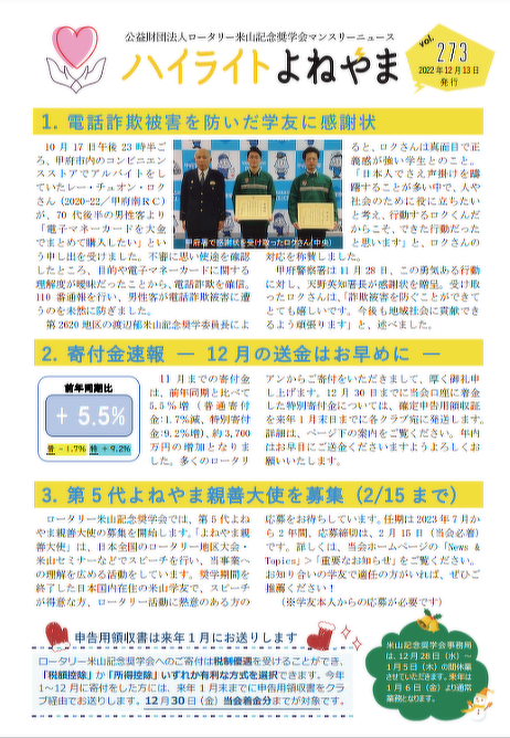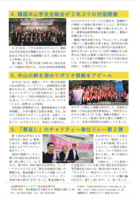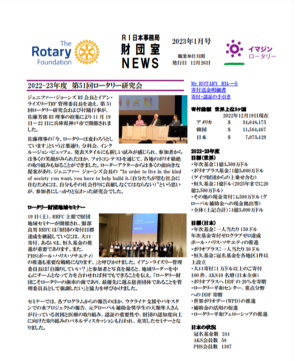 ジェニファー・ジョーンズRI会長を迎えて開催した第51回ロータリー研究会、近年4年間のポリオ発生状況、ワインボトルを砂に変えるプロジェクト、国際大会寄付者行事の案内、日本のロータリークラブによる様々なウクライナ支援の紹介、補助金事業の紹介など、盛りだくさんの内容です。ぜひ全文をお読みください。全文は画像をクリックするとダウンロードできます。
