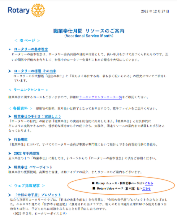 1月は職業奉仕月間です。職業奉仕に関するラーニング資料のほか、世界各国のロータリーの職業奉仕の例が紹介されています。