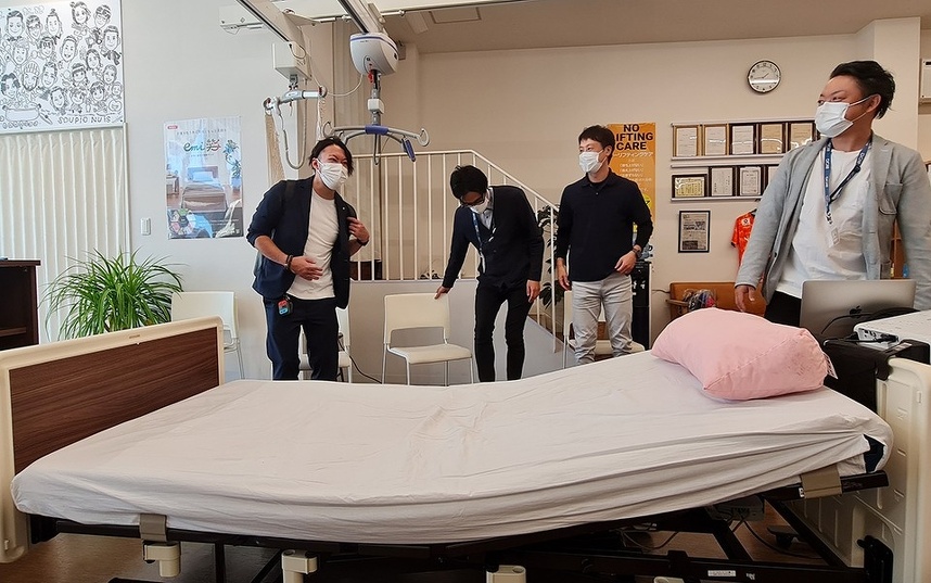 都築さんの会社では、実際に介護用のベッドやお風呂に吊るして移動できるハンモックのようなものを体験しました。見たことは何度かありましたが、こうして自分で使ってみるというのは初めてです。