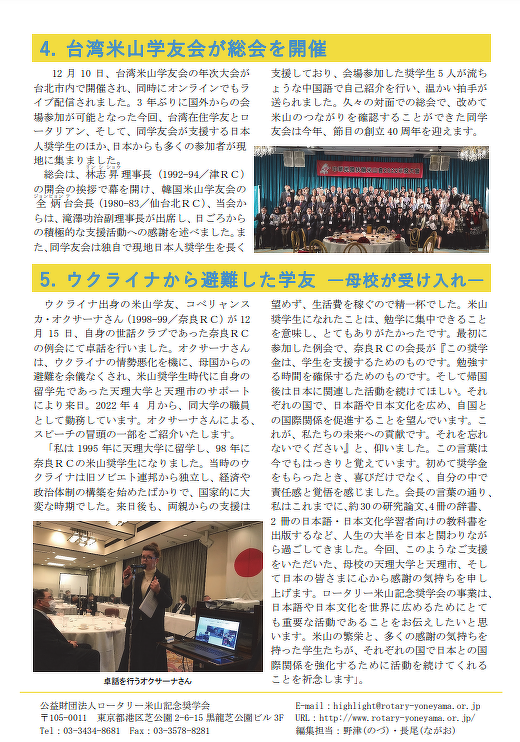 ジェニファー・ジョーンズRI会長を迎えて開催した第51回ロータリー研究会、近年4年間のポリオ発生状況、ワインボトルを砂に変えるプロジェクト、国際大会寄付者行事の案内、日本のロータリークラブによる様々なウクライナ支援の紹介、補助金事業の紹介など、盛りだくさんの内容です。ぜひ全文をお読みください。全文は画像をクリックするとダウンロードできます。