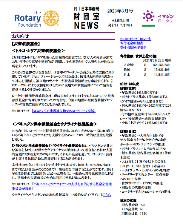 財団室ニュース3月号が届きました。ロータリー財団ではトルコ・シリア災害救援基金を設置して救援に乗り出すとともに、世界中のロータリアンにサポートを求めています。詳細はマイロータリーでご覧ください。財団室ニュースの全文は画像をクリックするとダウンロードできます。