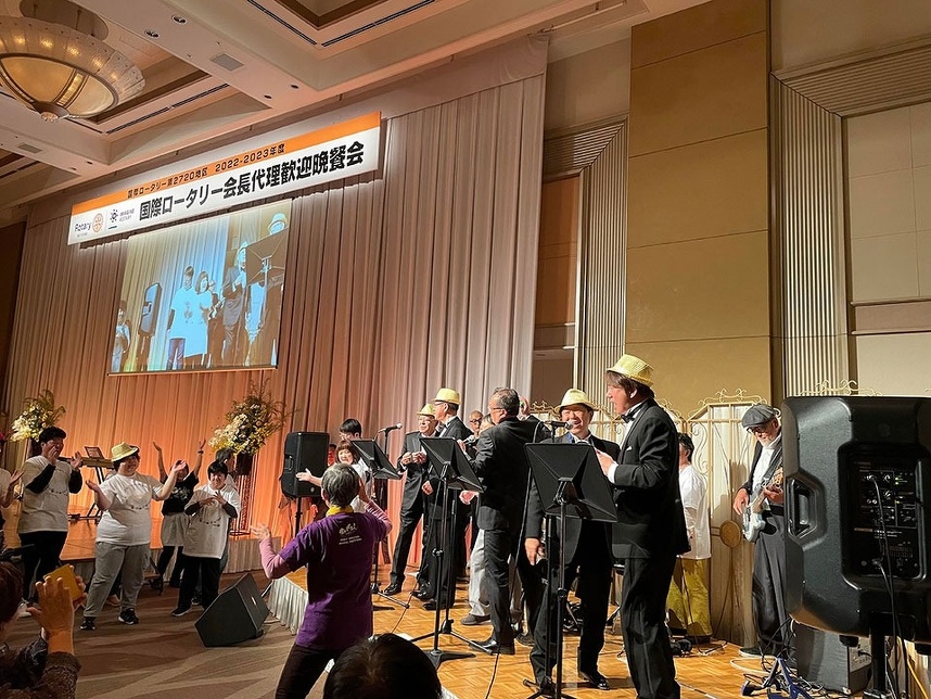 最後のアトラクションはオハイエ音楽隊も一緒になっての、我が2720地区のメンバーによる演奏でした!永田パストガバナ ー、硯川 パストガバナー、三村ガバナーノミニー、そして堀川ガバナーの美声で会場は大変盛り上がりました。「時代遅れの Rock ‘n’ Roll Band」、また見たいですね!