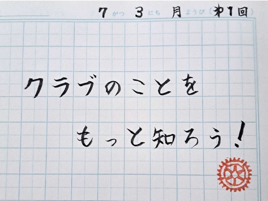恥ずかしながら、私自身もロータリークラブについて全てを知っているわけではありません。いや、それどころか全体の100分の1も知らないと思います。今回、会長という役割をさせていただきますが、その準備などに関しても初めて知ることだらけです。他クラブの方とお話しする機会も増えましたが、飛び交うロータリー用語に戸惑う場面もちらほらあります。そこでもう一度、いろはの「い」から学びたいと思いました。皆さん、初心に戻ってぜひ一緒に学んでいきましょう!
