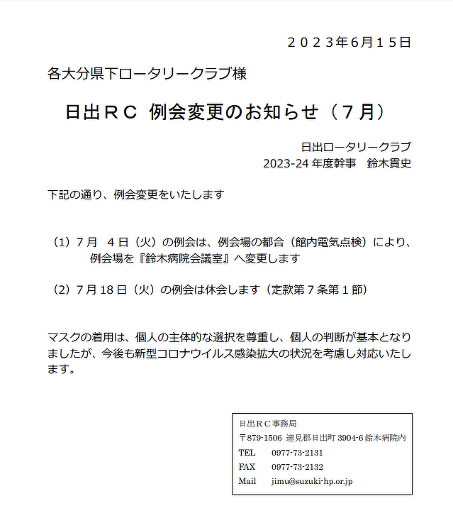 既にFacebook などでお知らせをしていますが、7/24(月曜日)の18時半から大分臨海RC様と我々O.K.Eクラブが合同で行う「ガバナー公式訪問例会」が大分市内(ホテル日航大分オアシスタワー3階)でございます。