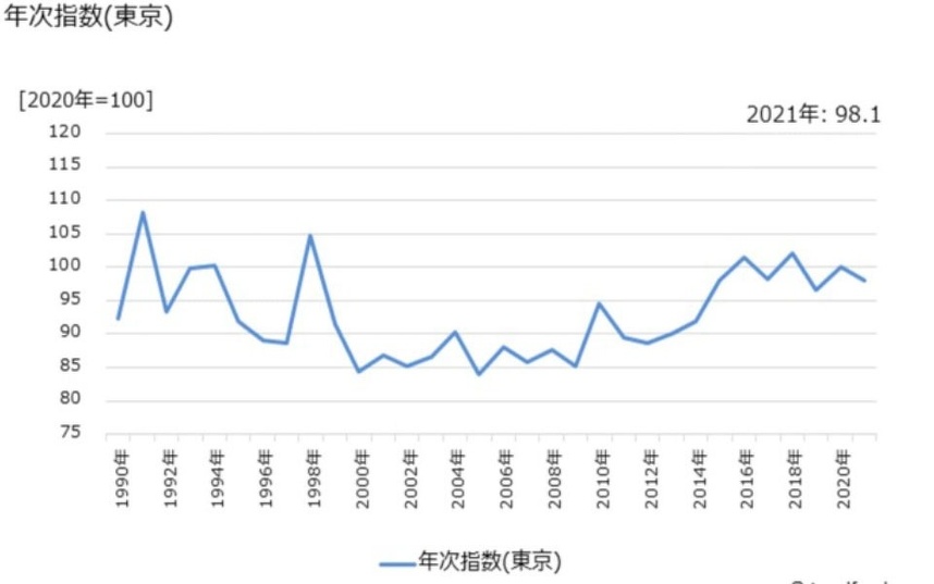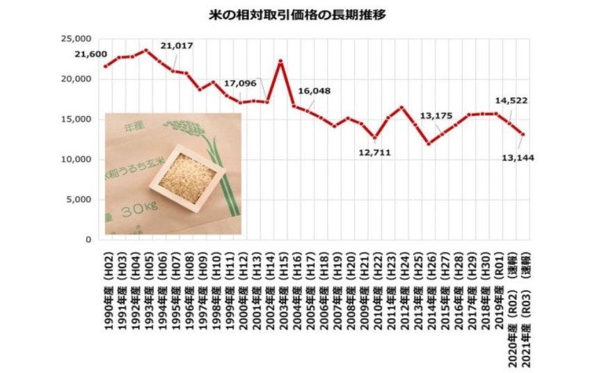 農業の現状についてですが、この数十年で一番の物価高が続いている中、生鮮野菜は、この20年間で変わらず、お米に関しては下がり続けています。
