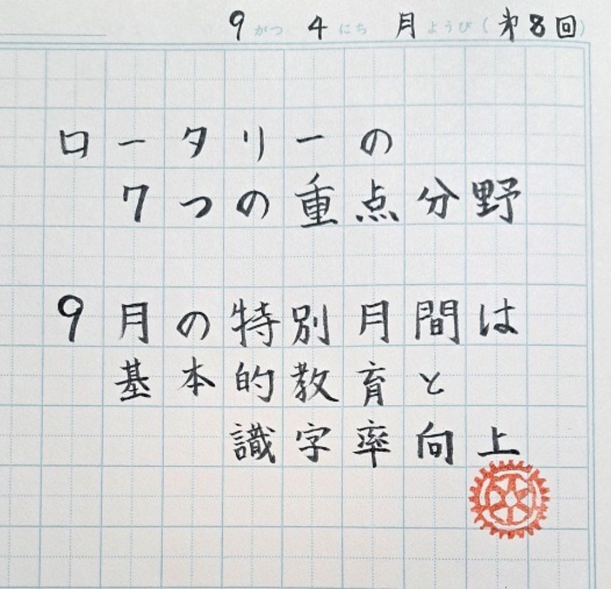 9月は「基本的教育と識字率向上月間」です。つまり、全世界のロータリアンが今月は「基本的教育と識字率向上」について考え、行動していこうとしているわけです。そして、この内容は「7つの重点分野」の内の1つに該当します。