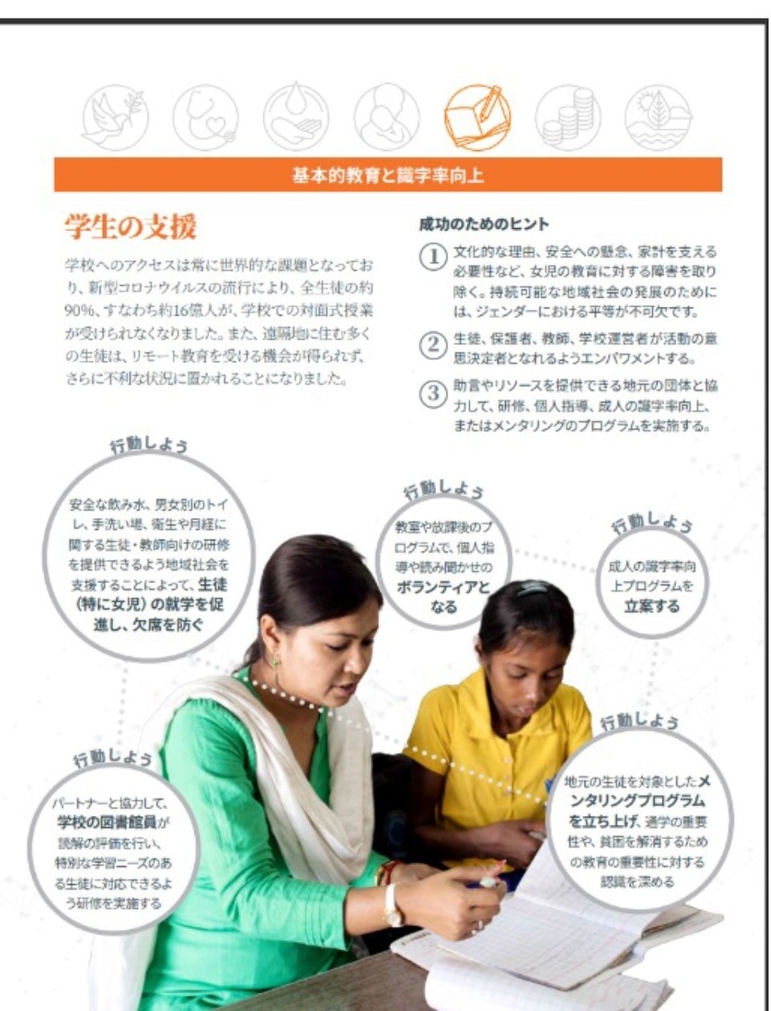 世界の国々の中で子供たちが基本的な教育を受けられない、また成人が十分に読み書きできない地域があり、そうした地域で基本的教育を提供し、識字率を上げることで、貧困を減らし健康状態を改善し、地域社会の発展につなげることが大切です。
