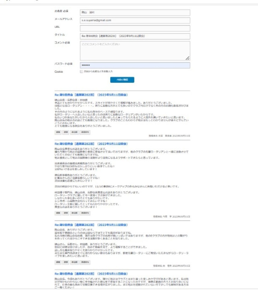出席は「今週の例会」ページの下段にある会員の氏名とメールアドレスが入ったコメント欄から「例会のコメント」をすることで例会への出席とさせて頂きます。投稿後に内容が確実に反映されたかを確認して頂けると安心できます。