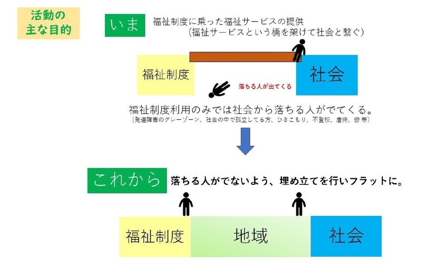 橋をかけるだけでは落ちる人がいるので、埋め立てをしてフラットにしていかないといけないと思っている。それができるのが『地域』だと感じて動いている。